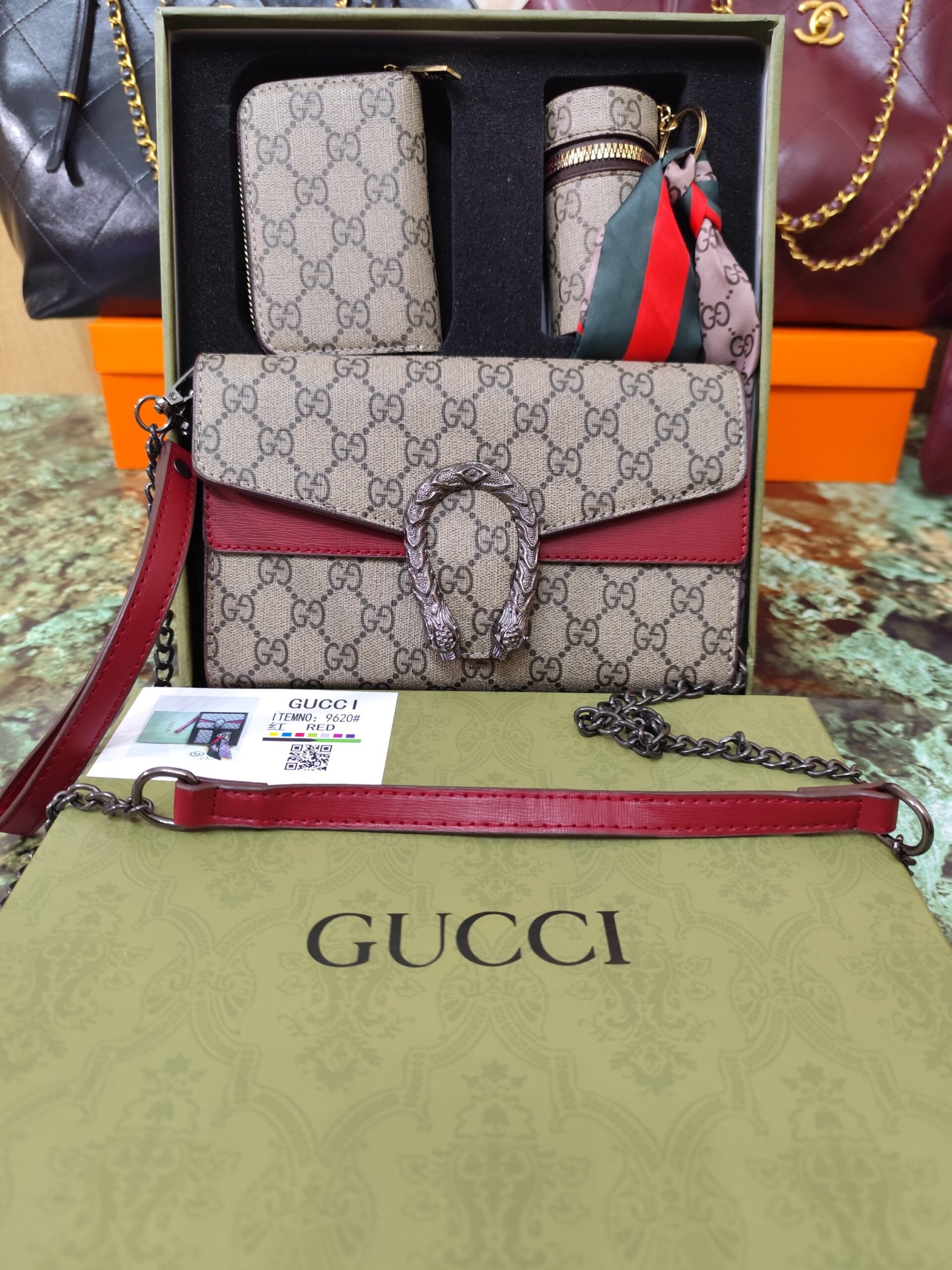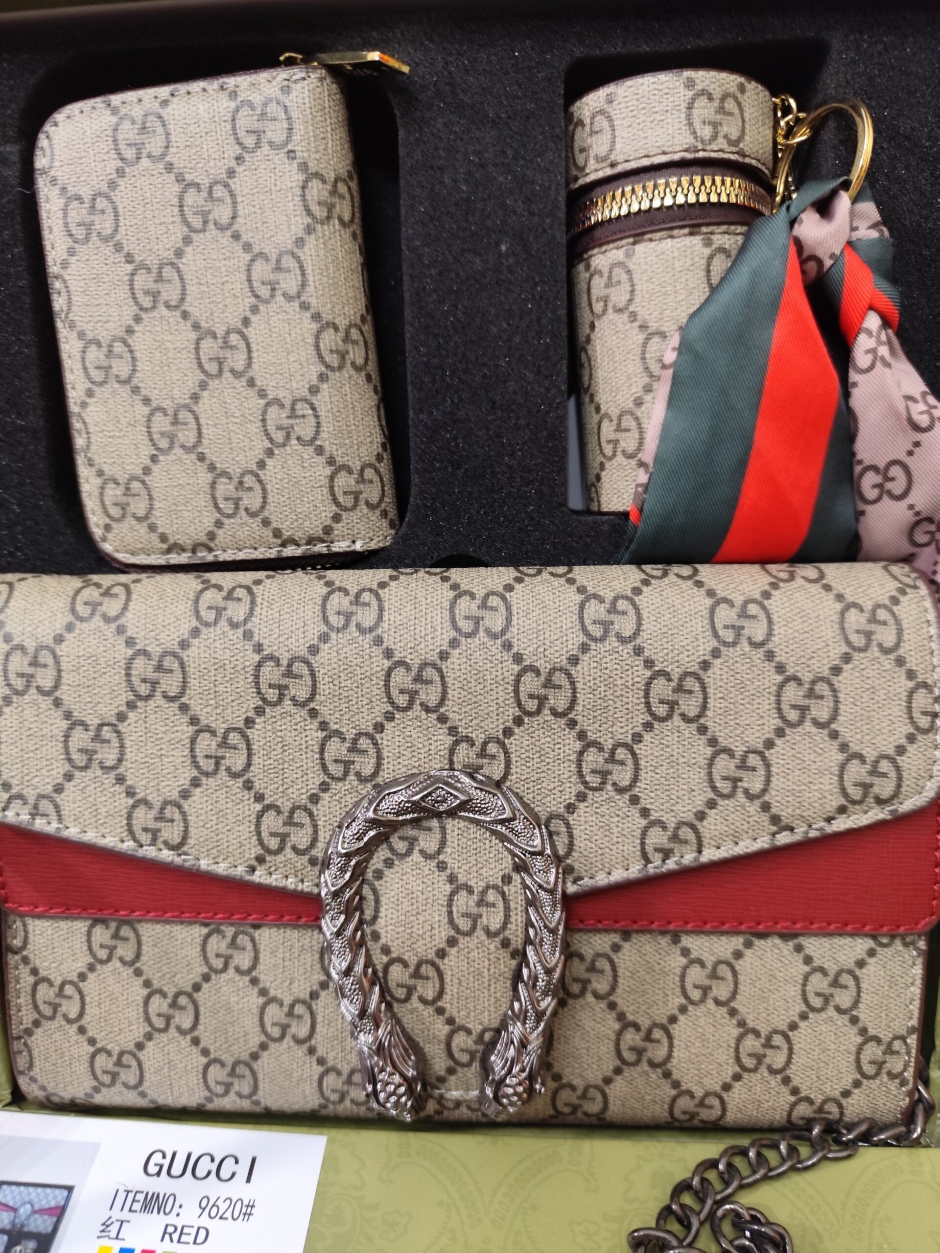 Bolsos GG, alta calidad, estampado clásico/rojo. Incluye 3 piezas ( bolso, monedero, llavero )y trae 2 asas. Viene con su certificado y caja.