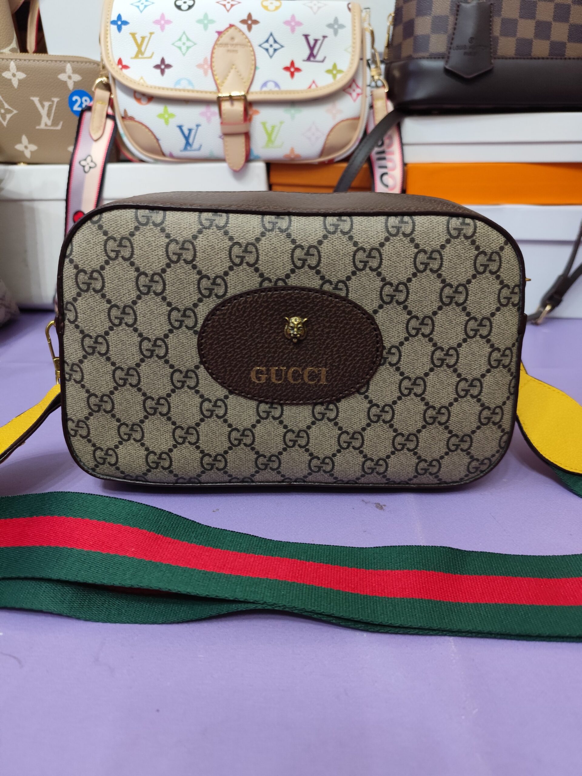 Bolsos GG, correa roja, verde y amarillo.