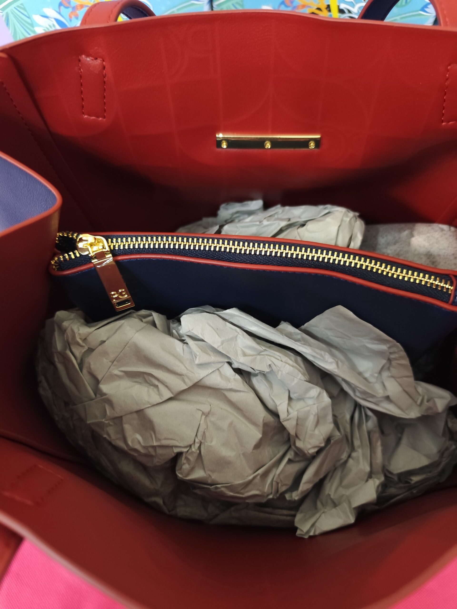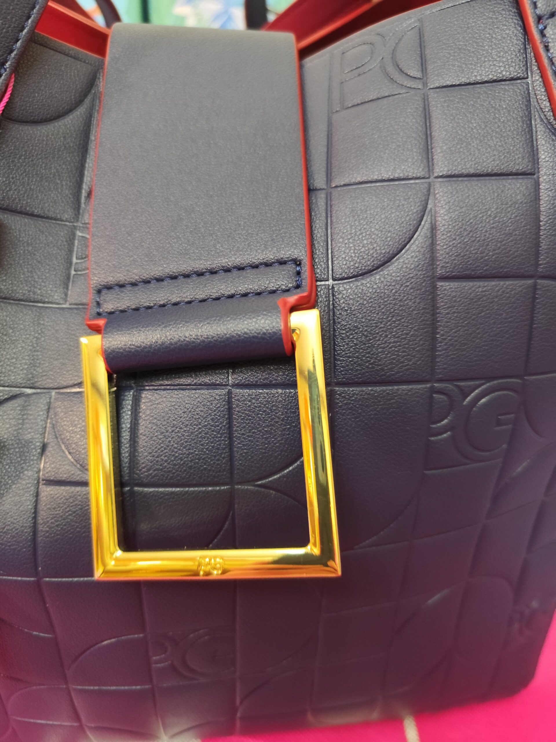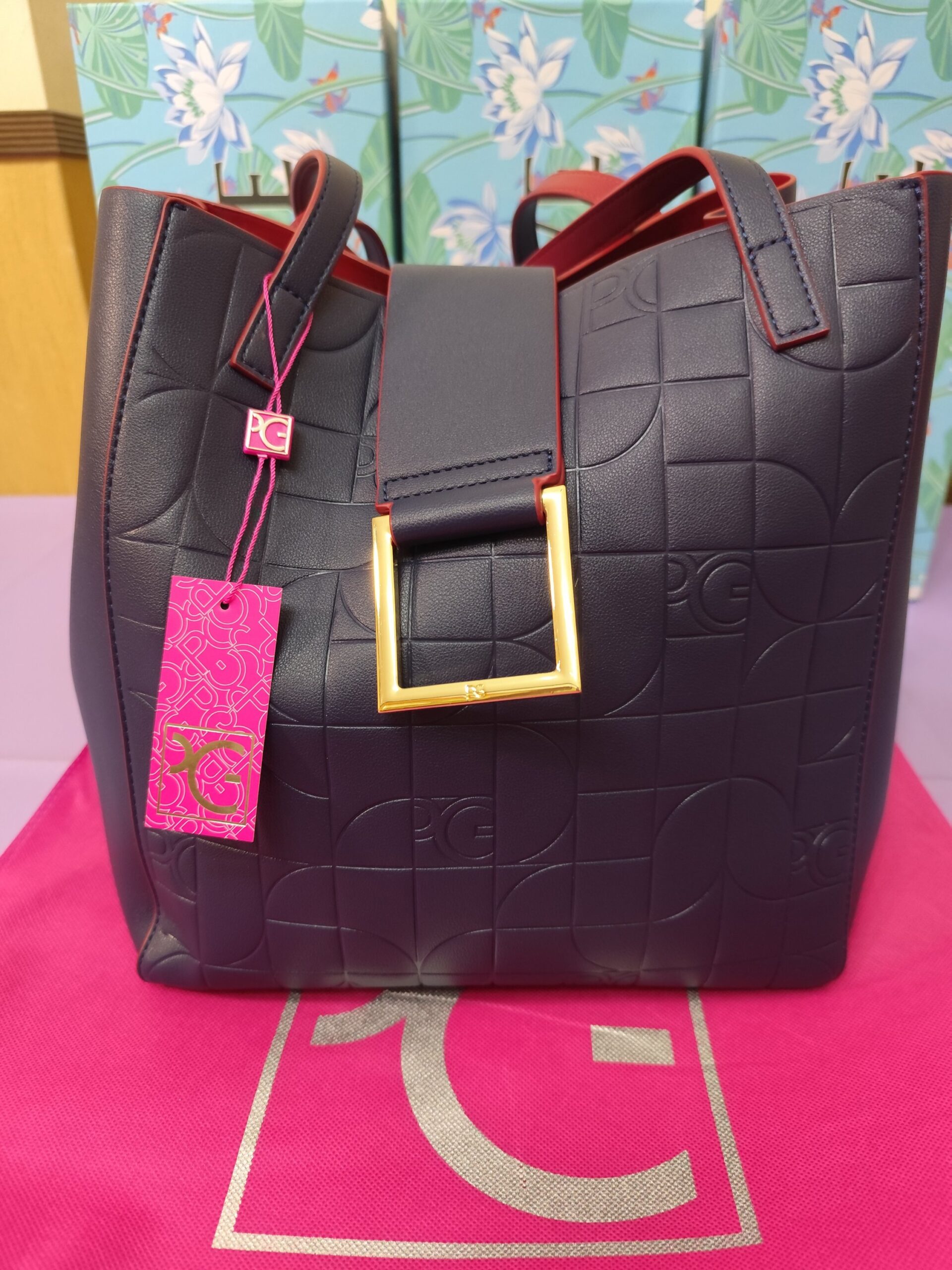 Bolsos PG, alta calidad, grande azul marino. Interior burdeos. Trae su guardapolvos de tela rosa fucsia.