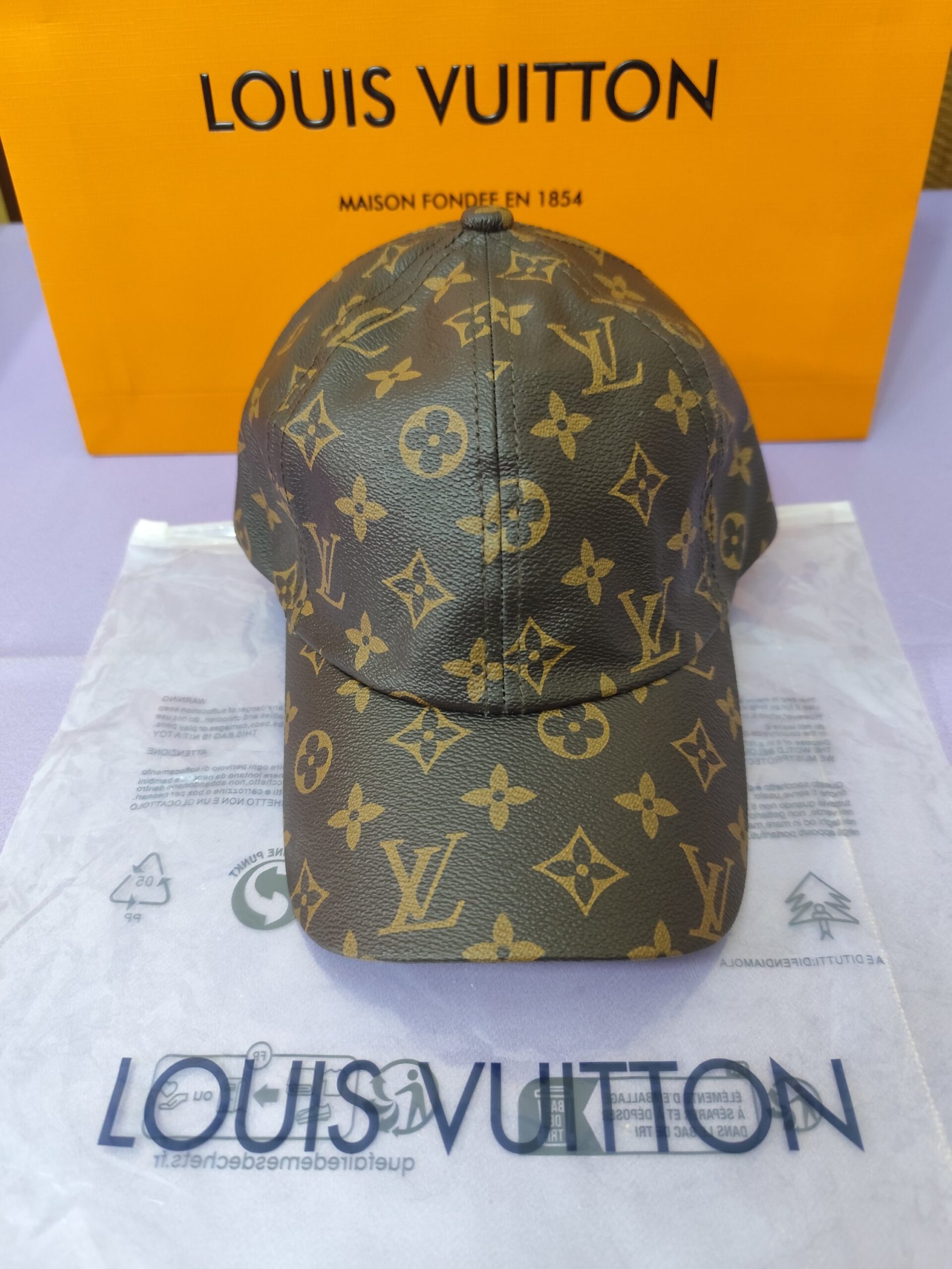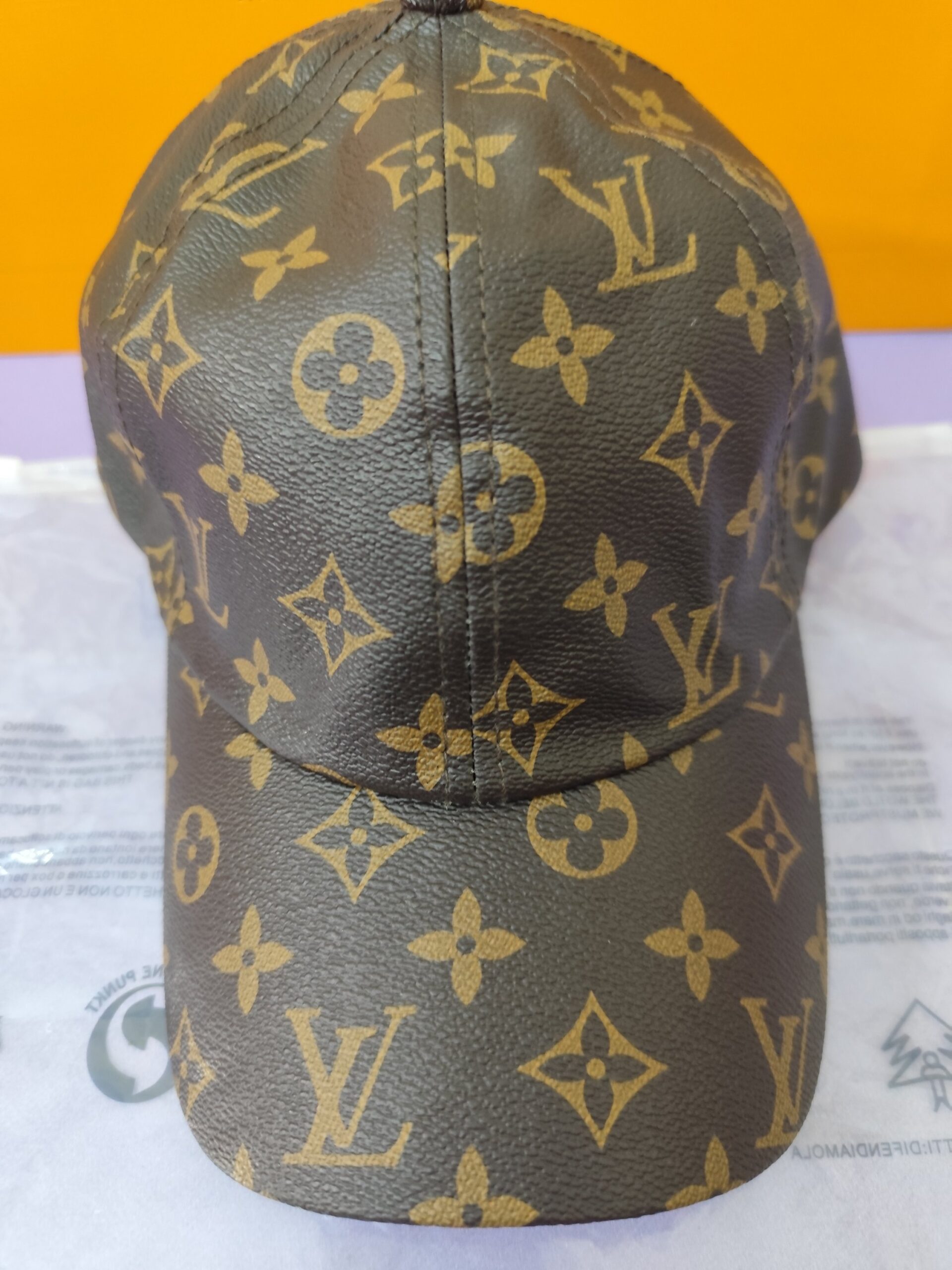 Gorra LV, calidad superior, piel estampado clásico marrón. Trae su funda y bolsa de papel marcada.